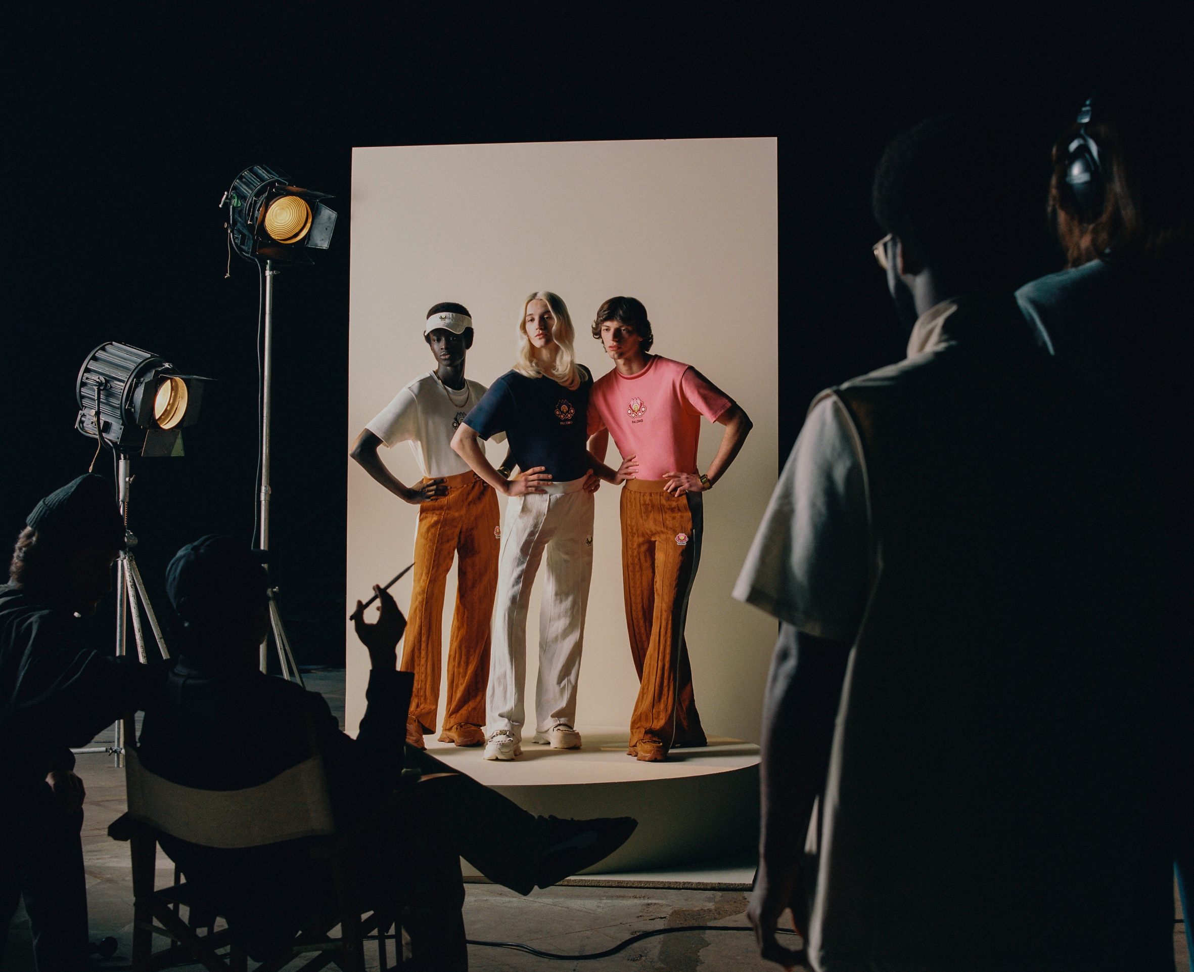 Inspired by the nostalgic allure of a sporty icon from the ’70s, the latest PUMA and Palomo campaign offers a peek behind the scenes of an advertisement shoot. Set within a studio reminiscent of Hollywood’s golden era, the backdrop merges seamlessly with the narrative. Bathed in perfect lighting, models exude effortless charm as they rehearse their movements gracefully juxtaposed against the shadowy figures of production staff.