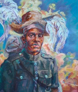 Through his painting ‘Dyani Mfengu on the Kei River [1835]’, Ruga pays homage to the Mfengu Levy, a group of black pioneers who played a pivotal role in British victories against the Xhosa. The character’s attire symbolizes a schism between different cultural influences, reflecting the clash of British, Boer, and Xhosa identities on the battlefield.