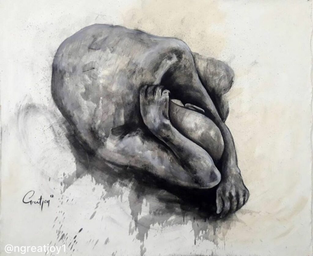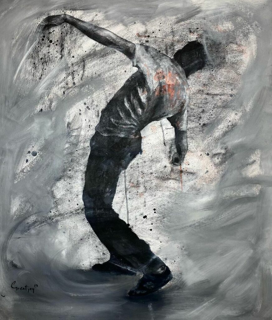GreatJoy’s work, focuses on masculinity, identity and the abstract representation of thought conceptions. His style merges motion and emotion, creating mental images that resonate with viewers. Combining expressionistic and representation ideas with figurative drawings, he adds an enthralling touch of abstraction to his works.