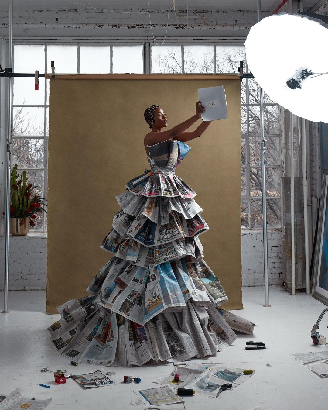 Artful Innovation: A Unique Newspaper Dress Shines in a Creative Photoshoot