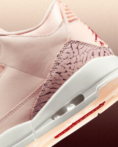 The Air Jordan 3 features a blush pink leather upper, making it stand out from the usual designs. Instead of the typical cement grey, this version has pink elephant print accents.