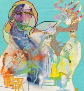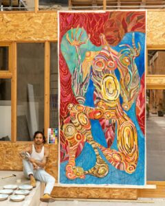 Khwezi Strydom, a painter,  whose work is a mix of modernity and traditional ethnic cultures. Influenced by his Tunisian mother and South African father, Khwezi’s art reflects his diverse heritage and his exploration of the coexistence between globalized culture and traditional values.