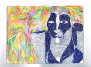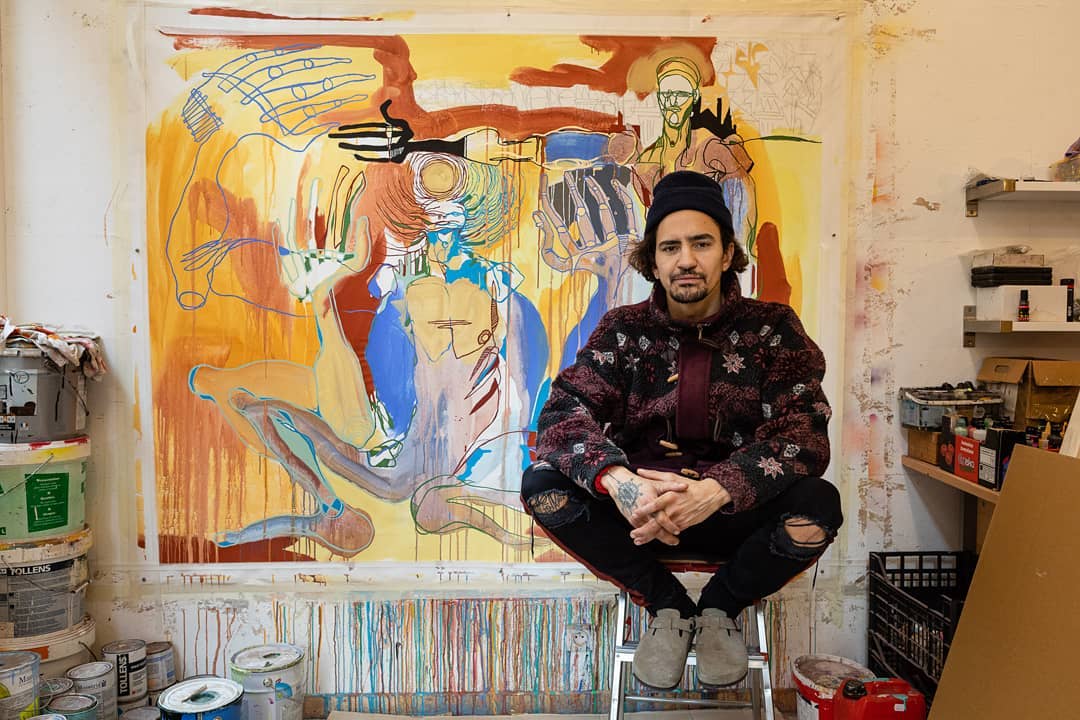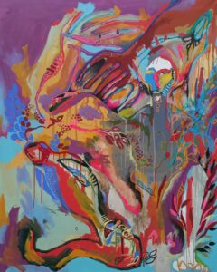Khwezi Strydom, a painter,  whose work is a mix of modernity and traditional ethnic cultures. Influenced by his Tunisian mother and South African father, Khwezi’s art reflects his diverse heritage and his exploration of the coexistence between globalized culture and traditional values.