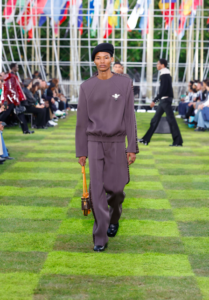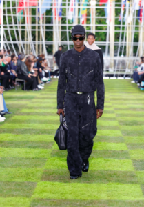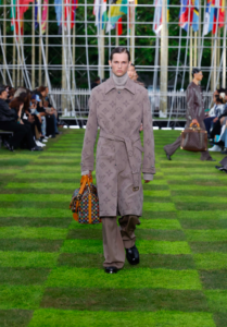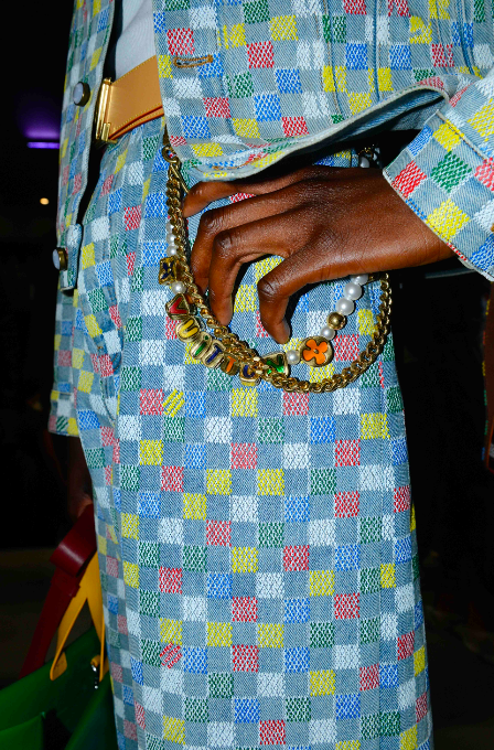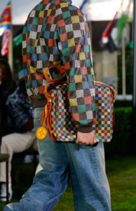 The collection features an artistic exchange with the creative collective, Air Afrique, who directed the show’s cinematic prelude and collaborated on logos and patterns. Founded in Paris in 2020, Air Afrique continues the legacy of the defunct Pan-African airline of the same name – airborne between 1961 and 2002 and known for supporting arts on the African continent – by highlighting Afro-diasporic arts, conversations and knowledge through multimedia formats and events. Its members count Lamine Diaoune, Djiby Kebe, Jeremy Konko and Ahmadou-Bamba Thiam. Informed by the check of original Air Afrique trunks, the collective collaborates on a tartan as well as a Damier-infused tartan explored in blueish green and brown nuances in ready-to-wear, scarves, stoles and bags. Air Afrique further co-creates a series of travel-inspired logos.