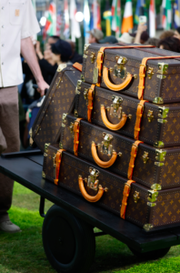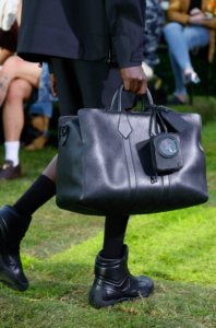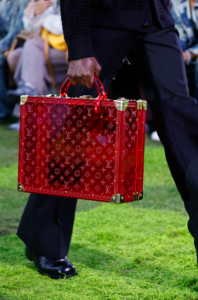 The illustrious Speedy P9 re-emerges in a series of tonal black adaptations, as well as faded fluo colours as if blanched by the sun, in several sizes including the new Speedy 30. The emblematic new LVERS Damier motif, which scales up the classic Damier chequers and renders them in multi-colour, graces canvas bags embellished with “LVERS United” tags as well as denim jacquard bags offset with Damier silk-print. The black leather of Silhouette bags is imprinted with the skin-like outlines of luggage tags, buckles and straps. A plexiglass Courrier Lozine appears in vibrant red with embossed Monogram. Bags and trunks created as part of the collaboration with Air Afrique are crafted in blueish green tartan and morphed with Damier chequers, and embellished with planet logo tags. Drawing on carrier bags, the leather Packaging line evolves in new colours and in a Messenger shape inspired by the Maison’s shoe boxes. Micro-Perfo bags crafted by aviation artisans appear in tonal black needle-punched Monogram leather across icons. Shiny leather LV Night bags with pearl details take inspiration from bomber jackets. A series of bags are hand-crafted entirely in pearls. Artisanally-amplified exotics with bijou and Monogram elements feature in Speedys and shoppers. The newest evolution in the Horizon line designed by Marc Newson, the collection debuts the Horizon Aluminium suitcase created from state-of-the-art engineering in design and functionality. In keeping with the spirit of the collection, the show features a series of travel-centric silhouettes including the Sirius, the Alma, the Porte and the Never-Everfull, a new travel version of the Neverfull.