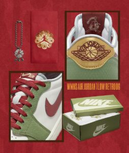 To add to the  spirit, the shoe comes with special ornament hang tags and a Jordan-branded red envelope, a nod to Chinese New Year traditions.  The upper of the Air Jordan 1 Low SE features a “Sail” leather base that beautifully complements the “Oil Green” scale overlays, extending from the mudguard to the heel counter.