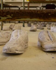 Matikinca, who won the 2023 Sasol new Signatures Art Competition, uses her artwork to shed light on the challenges faced by learners from underprivileged backgrounds in public schools. Her award-winning pieces focus on disparities in basic necessities like school shoes, symbolised through fragile clay castings. For her solo exhibition, she continues this narrative exploring themes of overcrowded classrooms and inadequate school supplies.