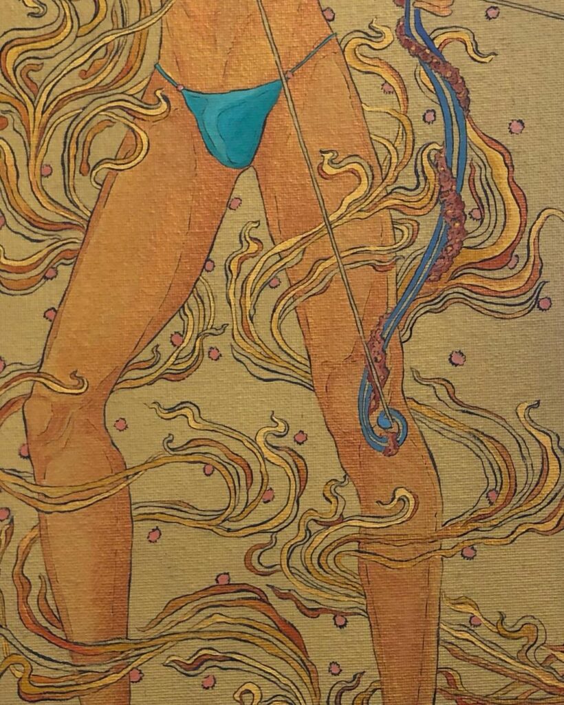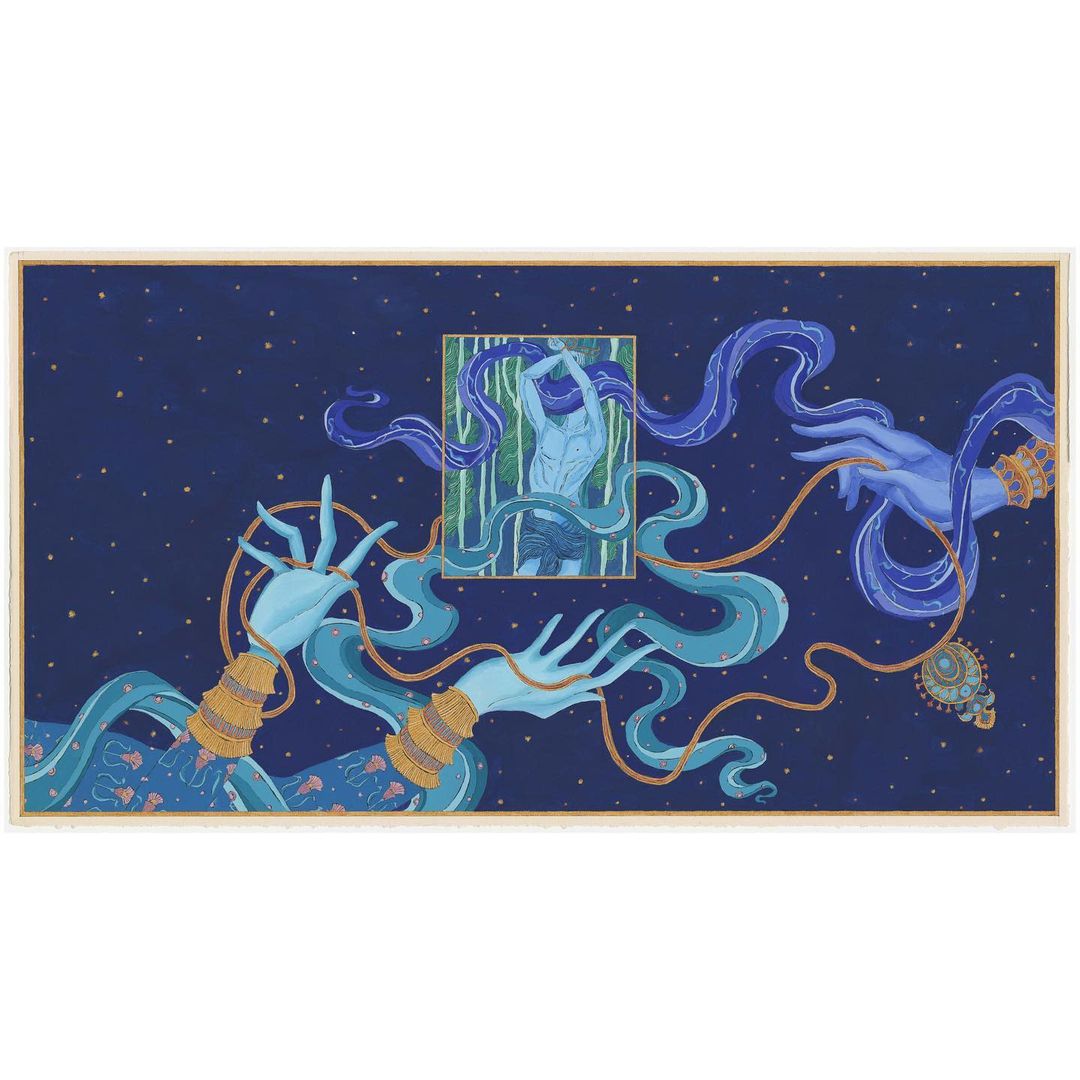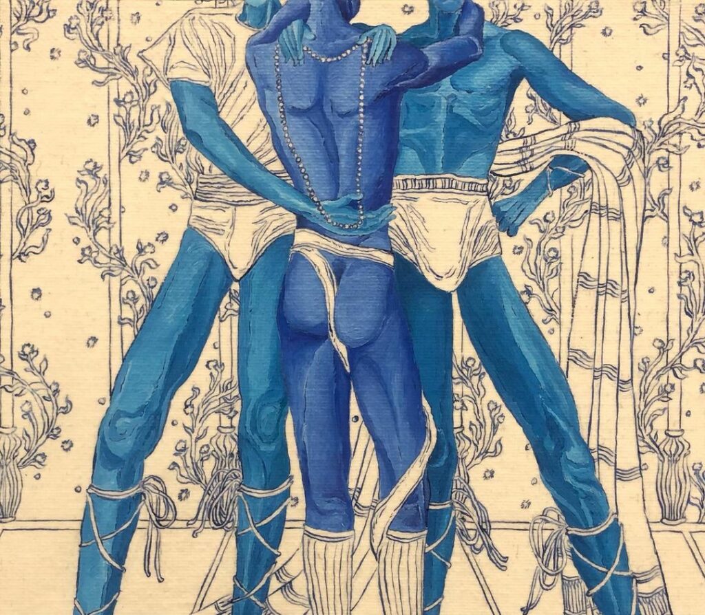 Solanki’s art is a powerful platform for the expression and celebration of his identity as a queer man. With his work, he reshapes the narrative surrounding traditional eastern art infusing it with his own perspective. His vibrant use of the colour blue further enhances the dreamlike quality of his art, inviting viewers to immerse themselves in a world where identity is celebrated and embraced.