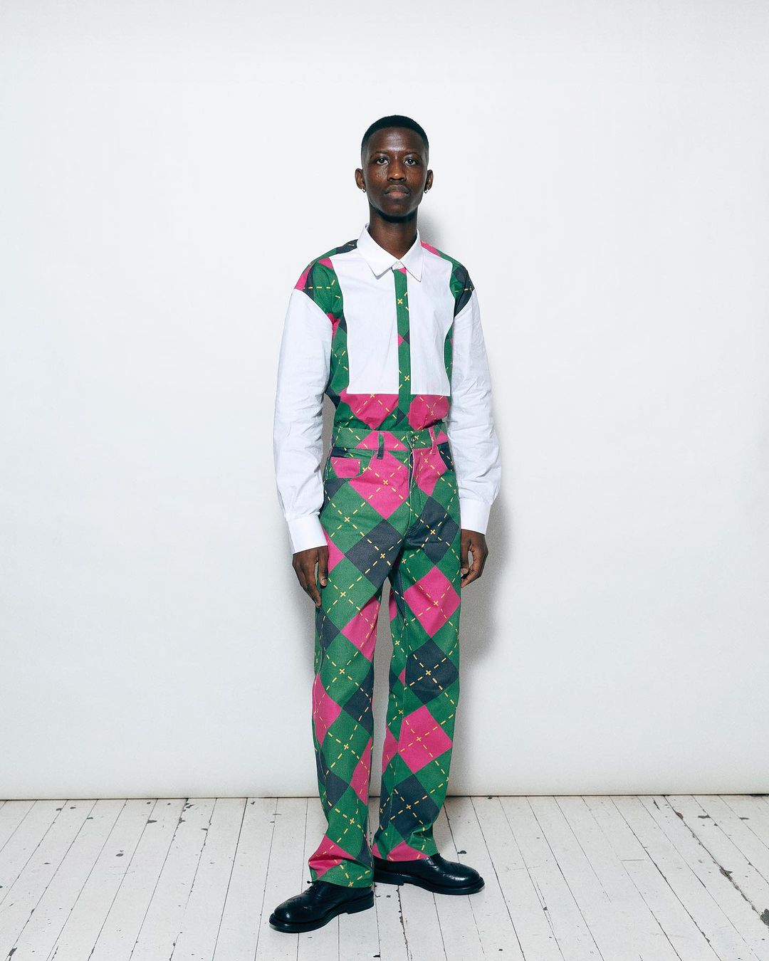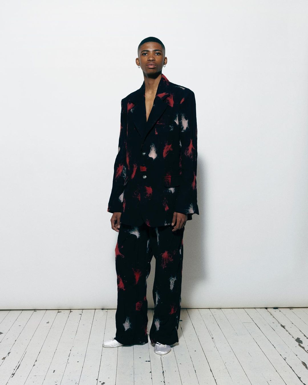 The collection has references from different natives. It consists of the ‘Me Fie’ pieces, which means ‘home’ in the Akan language deriving from Ghana. Lephoto teamed up with Stephanie Bentum who is a South African artist that specializes in textiles and garment deconstruction, they worked on a two-piece suit with wool patch finishes.