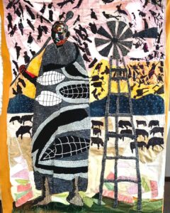 Asanda Kupa, born in the Eastern Cape, draws inspiration from social movements and protests. His artwork, titled “Emhlabeni Ongcwele”, is a colourful embroidered tapestry made with the help of the Keiskamma Arts Project. The piece looks at factors such as justice, resilience, and hope. Kupa has showcased his art around the world, including in France and the United States, and this is his second exhibition in the UK.