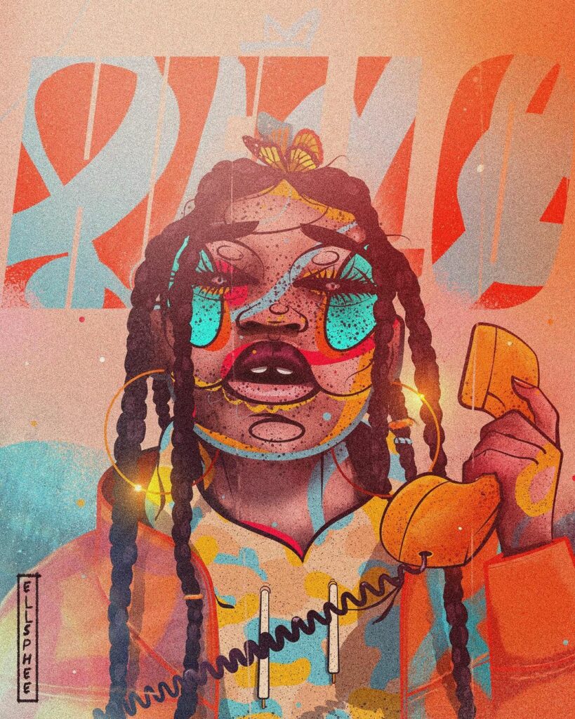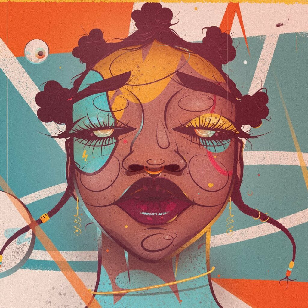 This monochromatic stage allows him to ensure that the artwork’s composition works before introducing colours. Once satisfied, Gumede duplicates the artboard and starts the mesmerizing colour process. His love for bright hues brings an intriguing juxtaposition to the artwork, symbolising the duality he seeks to convey. Finally, he fine-tunes the artwork in Photoshop, adjusting colours and retouching as needed.