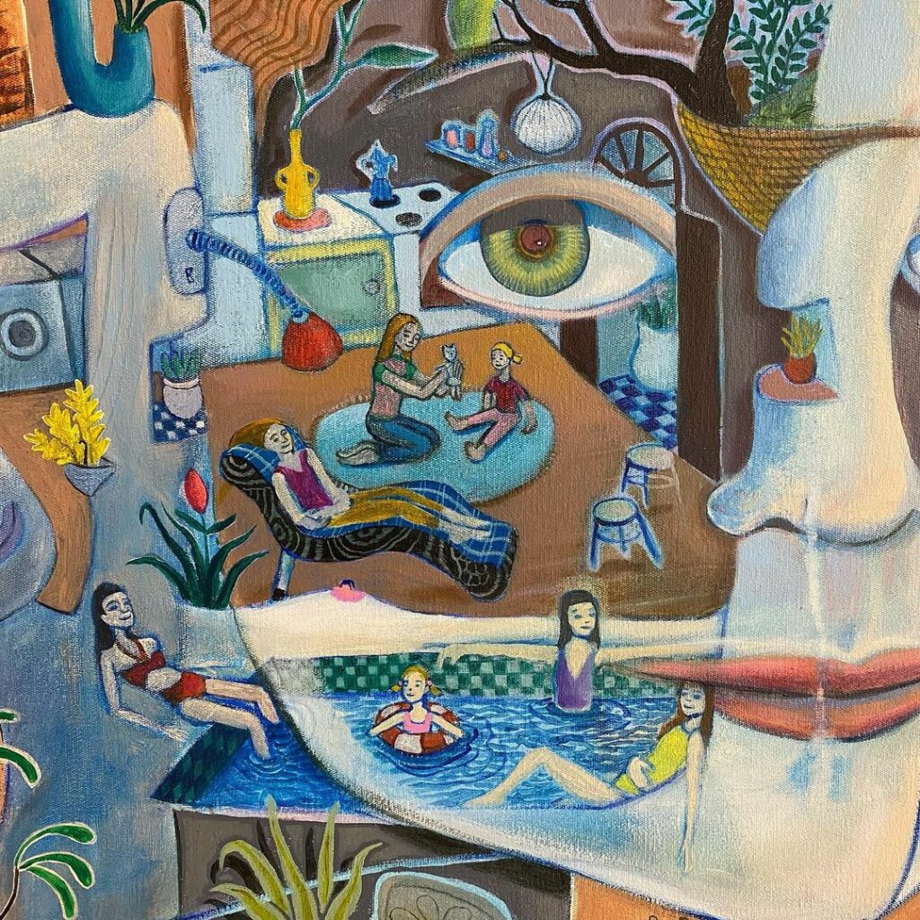 One of the recurring themes in Steyn’s work in the depiction of the environment with a human face. Her paintings often feature animated landscapes with multiple chins, noses and knowing eyes. Smiling lips and undulating human bodies unfold and transform into something new, creating a sense of constant motion and fluidity.