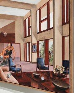 This referential element adds depth and context to her pieces, allowing her to explore spaces beyond her own reach and that of her viewers. She also incorporates furniture and decorative pieces that evoke aspirational lifestyles portrayed in decor magazines, to enhance the narrative of her artworks.