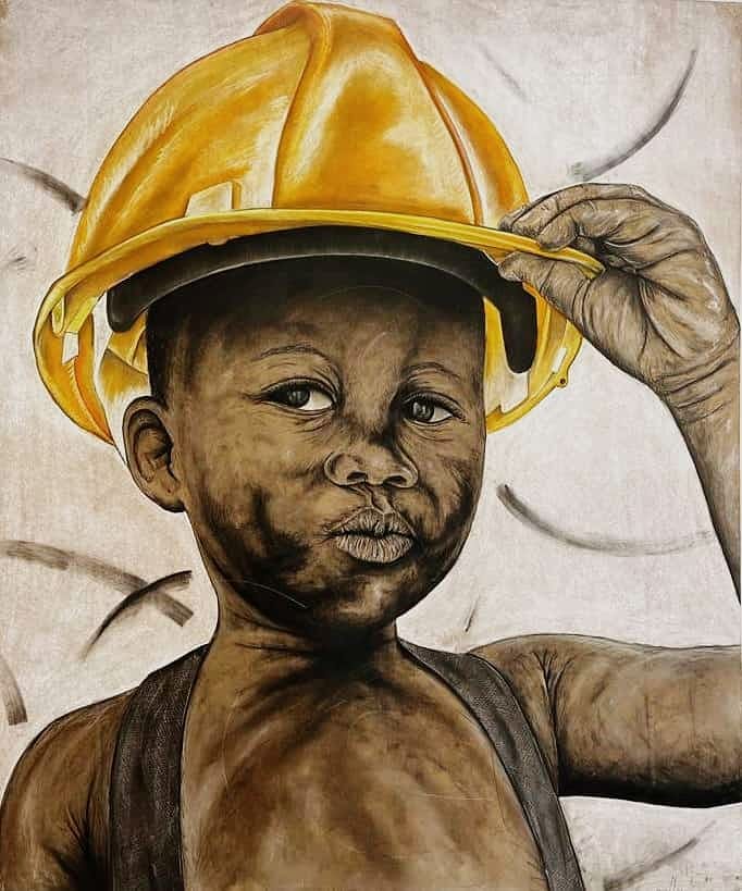 Maluleke’s prints often depict a child wearing a brightly coloured hardhat or carrying a shovel. It is important to note that these images should not be misconstrued as child labour, but rather seen through the eyes of a child who idolizes the idea of their absent father.