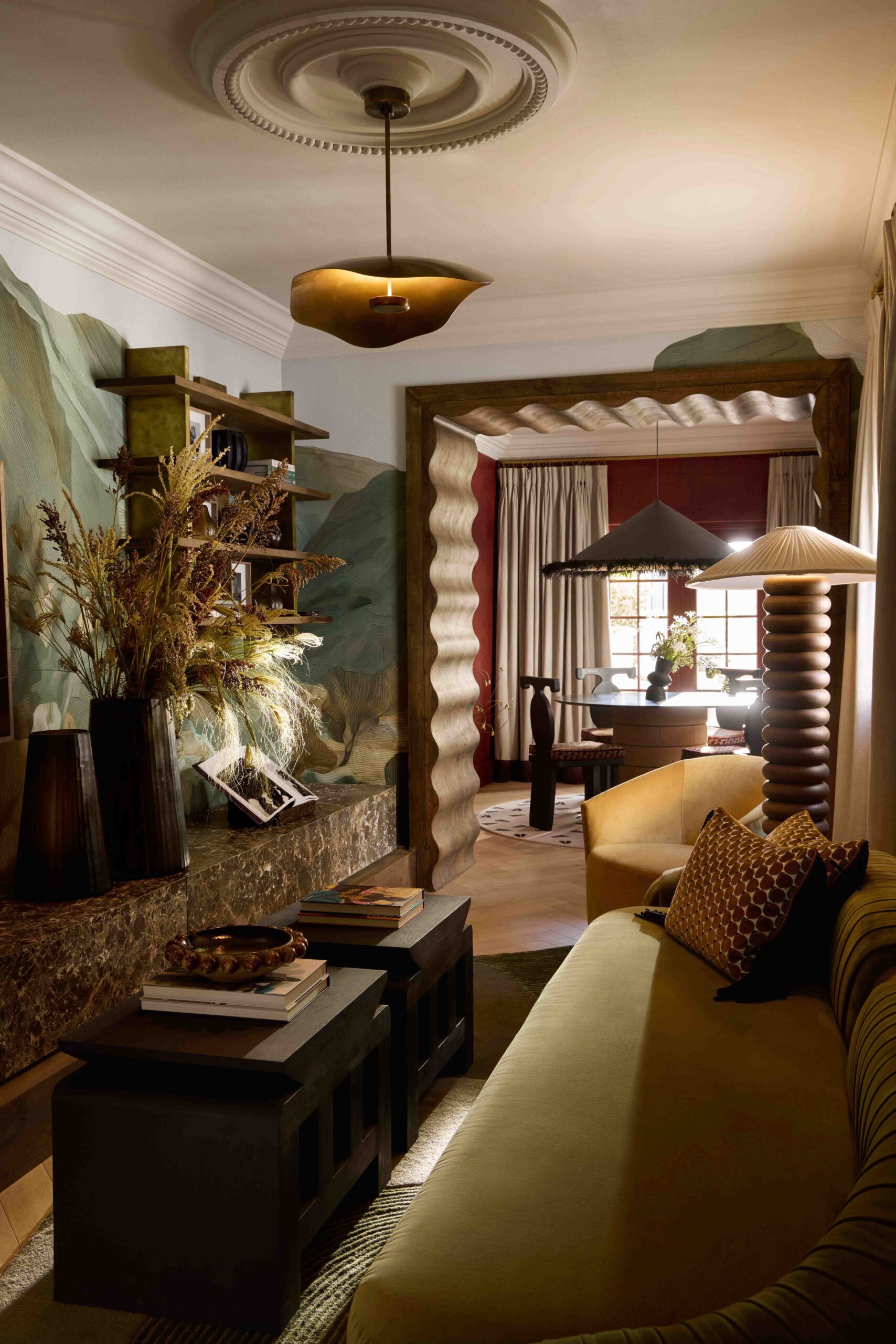 - Cultural symbolism in design: A bespoke dining pendant inspired by the Basotho hat, handcrafted chairs echoing traditional pottery, and panoramic wallpaper tracing South Africa’s landscapes.